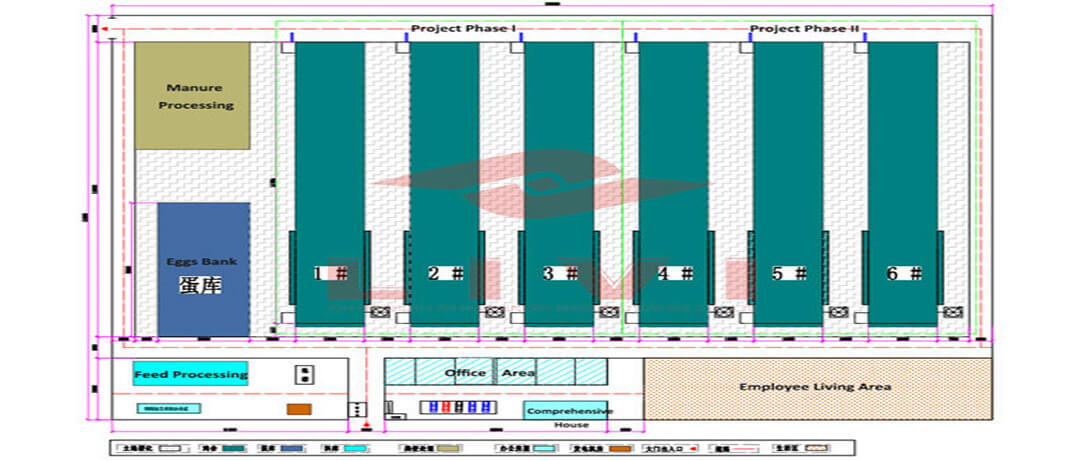 Chicken House Layout: 6 Houses/Farm, 50,000 layers/house.